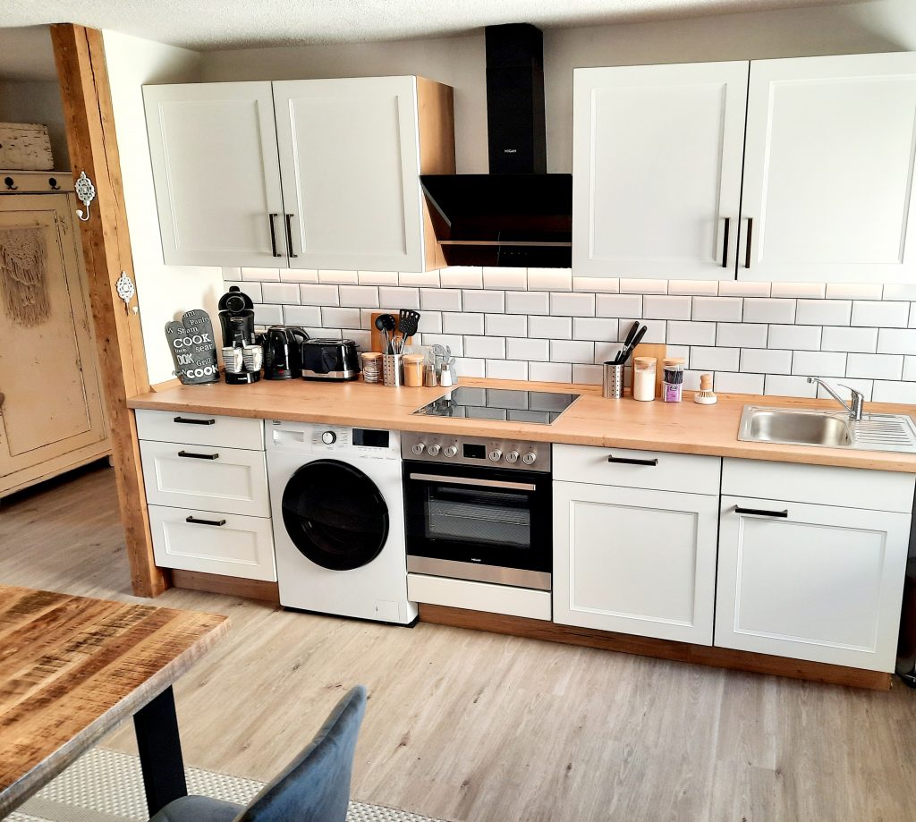 Die Küche ist ausgestattet mit Mikrowelle, Gefrierkombi, Ceran-Kochfeld, Backofen, Waschmaschine mit Trockner, Geschirrspüler, Wasserkocher, Toaster, Kaffee- Espressomaschine.